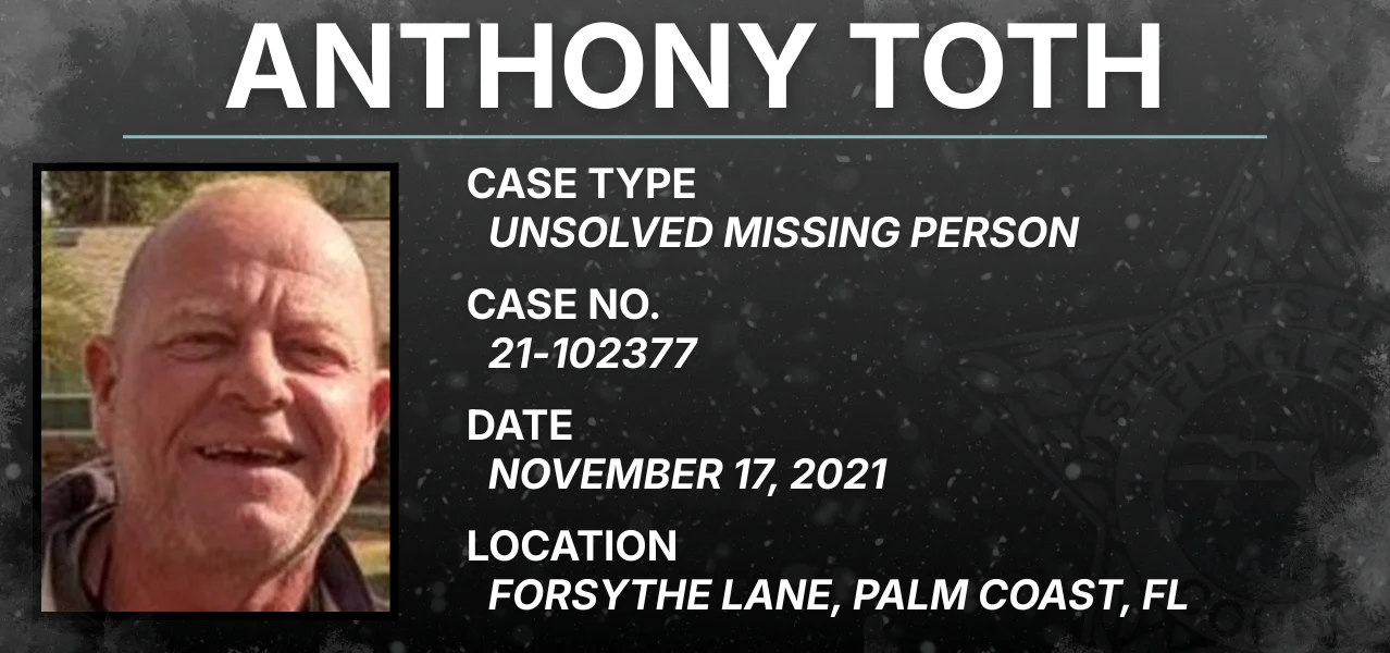 In November 2021, Anthony Toth was staying with a friend on Forsythe Lane in Palm Coast. On Nov. 17, Anthony left his friend’s home, and has not been seen or heard from since. Anthony had often talked about living “off the grid.”
